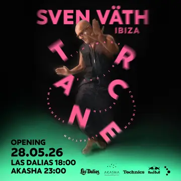 Sven Väth / T.R.A.N.C.E Opening 2026 takes place at the renowned Akasha Las Dalias Club - Ibiza in Ibiza, Spain on Thursday, May 28, 2026, featuring Maurizio Schmitz. This event brings together artists and fans who share a passion for dance music culture and electronic sounds.