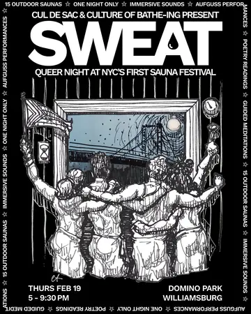 We’re back -- and we’re taking a field trip across the river. <3 This Thursday, for one night only, CUL DE SAC brings it's sauna + sound pop up to the Williamsburg waterfront for a special Queer Night takeover of Culture of Bathe-ing’s sauna village at Domino Park. ✩ PROGRAM ✩ 𖦹 Guided and unguided sauna sessions across 15 outdoor saunas 𖦹 Curated sounds by KXAH, CARPET (F.L.H.P.), + more 𖦹 Performances by artists Gio Black Peter, Brian Kelly, Devin Richey, Mamiko Nakatsugawa, Nate Daubert, + more 𖦹 Guided meditations by Tiv Adler, Kaylin Gibson, Paloma Suarez, Zoë Rose Hamilton, Caroline Güntert + more ✩ WHAT TO BRING ✩ Swimsuit Towel Water-friendly footwear ✩ CHECK-IN ✩ Please check in at One Domino Square — entry door off Kent Avenue. ✩ CHANGING ROOMS ✩ Private changing areas and lockers are available on site. ✩ SAFER SPACE ✩ All bodies, all genders, all sizes. Consent and care are non-negotiable. No harassment, hate, or aggressive behavior. Sober space (no alcohol). ✩ ACCESSIBILITY ✩ Ground-level outdoor plaza with mixed paving and turf. Seating available in and near the sauna. Share access needs in advance with hi@culdesacculdesac.xyz and we’ll do our best to accommodate. Rain, snow, or shine, we sweat. Severe weather may delay. By attending you consent to respectful community documentation in public zones.