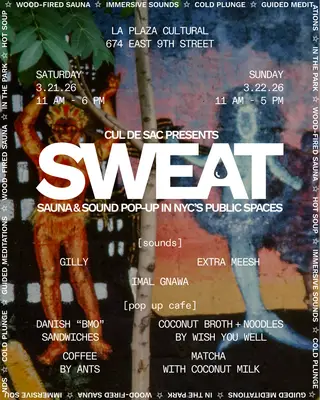 SWEAT #07: A Sauna & Sound Pop Up [Sat + Sun] takes place at La Plaza Cultural in New York City on March 21, 2026. Featuring Dj Gilly, Extra Meesh. Downtempo, Jazz.