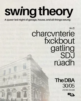 Swing Theory takes place at The DBA in Manchester, United Kingdom on May 30, 2026. Featuring Gatling, FXCKBOUT, SDJ (1), Rúadh. House and Garage sounds all night.