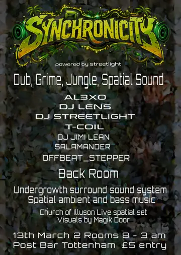 Synchronicity X Undergrowth @The Post Bar 2026 takes place at the renowned The Post Bar Tottenham in London, United Kingdom on Friday, March 13, 2026. This event brings together artists and fans who share a passion for dance music culture and Acid, Jungle sounds.