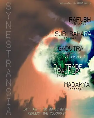 SYNESTRANSIA on April 14, 2026 at ., Berlin features Rafush, Gadutra, Sub Sahara, DJ Trade Trainer and MADAKYA performing ambient DJ sets.