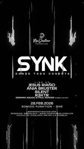 SYNK (DONDE TODO CONECTA) takes place at New Destino Electronic Club in Miami, United States on February 28, 2026. Featuring Dj.Silent.official. Techno sounds all night.