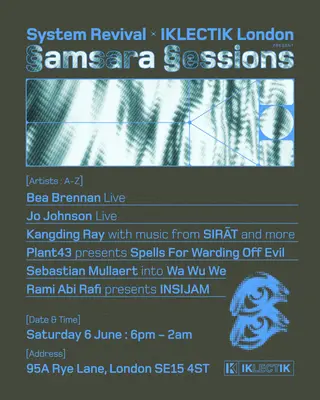 System Revival w/ Kangding Ray, Sebastian Mulleart, Jo Johnson, Plant43, Bea Brennan on June 6, 2026 at IKLECTIK, London features Kangding Ray, Sebastian Mullaert, Jo Johnson, Plant43 and Rami Abi Rafi performing ambient DJ sets.