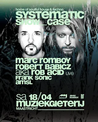 Systematic Maastricht on April 18, 2026 at Muziekgieterij, Maastricht features Marc Romboy, Robert Babicz, Frank Sonic and AMSL performing techno DJ sets.