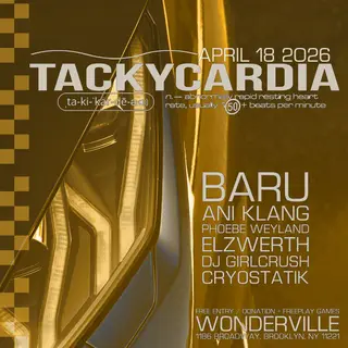 Tackycardia: 027 takes place at Wonderville in New York City, United States on April 18, 2026. Featuring Ani Klang, DJ girlcrush. Drum & Bass and Dubstep sounds all night.