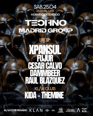 TECHNO MADRID GROUP special extended hours on April 25, 2026 at Klan Club Privado, Madrid features Xpansul, Fujur and Themine performing techno DJ sets.