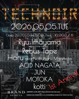 TECHNOIR -1st Anniv!- takes place at BRAND SHIBUYA in Tokyo, Japan on May 5, 2026. Techno sounds all night.