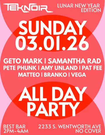 TBA - 2233 S Wentworth Ave in Chicago, United States presents TEKNOIR LUNAR NEW YEAR EDITION 2026, a curated electronic music experience on Sunday, March 1, 2026, featuring Geto Mark, samantha rad, Pete Phunk and 4 more artists. This event brings together artists and fans who share a passion for dance music culture and Techno, House sounds.