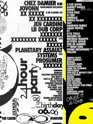 The Cause ∞ Forever: 8th Birthday - 24hr Non-Stop on June 6, 2026 at The Cause, London features Chez Damier, Jovonn, Jen Cardini, Planetary Assault Systems, Prosumer, A For Alpha, Audrey Danza, Bobby., Colin Dale, DJ Red, Emerald, Enrica Falqui, FAFF, Handson Family, Harri Pepper, KT, Kyle Toole, Maxime dB, Michelle Manetti, Mystery Affair, Phill de Janeiro, Benji King, Sound Metaphors Djs, Willow, Adrien Calvet, apex anomaly, Boboxa, Buggery Grips, CasuallyClued, Josh Keit, Dockett Eddy, Lulah Francs, MARINI, Maybe Laura, Ryan Ingleby, Ethan McNamara and Ryussi performing techno DJ sets.