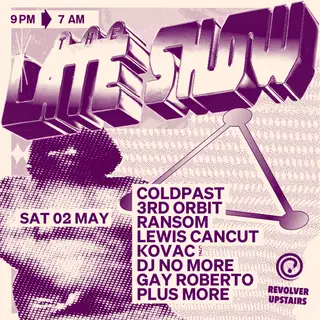 The Late Show takes place at Revolver Upstairs in Melbourne, Australia on May 2, 2026. Featuring 3rd Orbit, Kovac, Gay Roberto. House and Garage sounds all night.