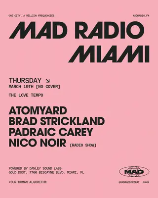 THE LOVE TEMPO: Atomyard, BRAD STRICKLAND, Padraic Carey, NICO NOIR takes place at Mad Radio Miami in Miami, United States on March 19, 2026. Featuring Atomyard, Padraic Carey. House.