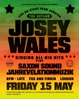 'The Outlaw' Josey Wales + Saxon Sound takes place at The Fox and Firkin in London, United Kingdom on May 15, 2026. Dub sounds all night.