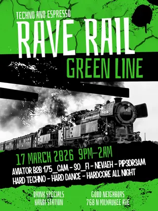 THE RAVE RAIL - TECHNO TRAIN PT2 takes place at TBA in Chicago, United States on March 17, 2026. Featuring PIP3DR3AM, NEVAEH. Techno and Hardcore sounds all night.
