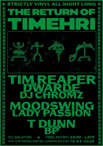 The Return Of Timehri W/ Tim Reaper, Dwarde, DJ Chromz, Lady Passion, Moodswing, T Dunn, BP takes place at Cu in London, United Kingdom on Friday, April 10, 2026. Featuring Tim Reaper, Dwarde, DJ Chromz, Lady Passion and 2 more. Garage, Jungle.