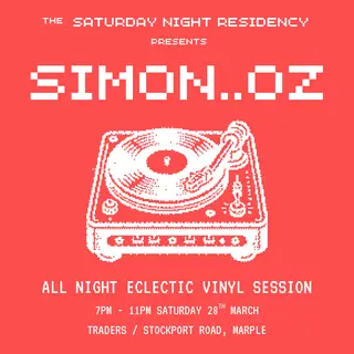 The Saturday Night Residency takes place at Traders in Manchester, United Kingdom on March 28, 2026. Balearic and Electronica sounds all night.