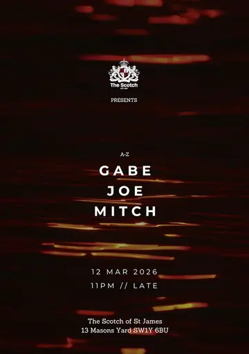 Set at Scotch, The Scotch: Mitch, Joe & Gabe 2026 brings together artists and fans in London on Thursday, March 12, 2026. This event brings together artists and fans who share a passion for dance music culture and House, Afro House sounds.