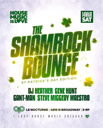 The Shamrock Bounce. A St. Patrick's House Music Day Party takes place at Le Nocturne in Chicago, United States on Saturday, March 14, 2026. Featuring DJ Heather, Gene Hunt, Gant-Man. House, Deep House.