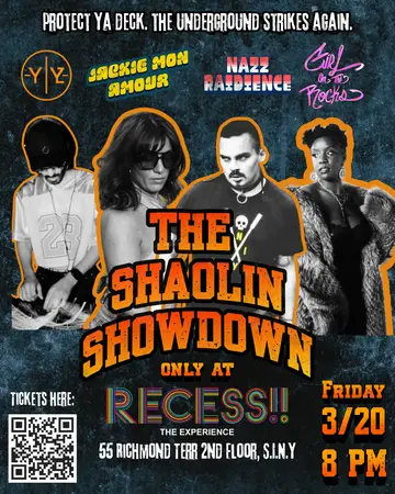 The Shaolin Showdown takes place at TBA - Recess The Experience in New York City, Unknown on March 20, 2026. Techno, Club.