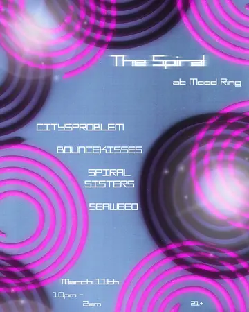 The Spiral takes place at Mood Ring in New York City, Unknown on Wednesday, March 11, 2026. Featuring CITYSPROBLEM, bounce kisses, Soo Intoit, Xana 101.