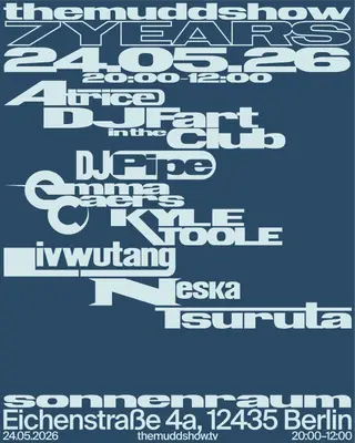 themuddshow 7 years on May 24, 2026 at Sonnenraum, Berlin features Atrice, DJ Fart in the Club, DJ Pipe, Emma Caers, Kyle Toole, livwutang and Neska performing DJ sets.