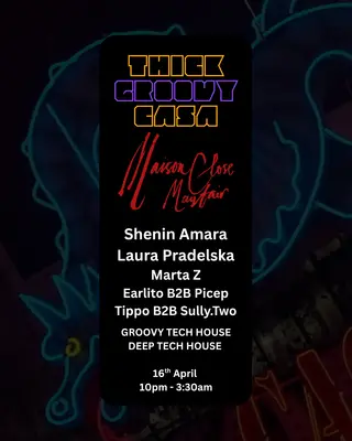 Thick Groovy Casa II takes place at Maison Close in London, United Kingdom on April 16, 2026. Featuring Shenin Amara, Laura Pradelska, Picep. Tech House and Deep House sounds all night.