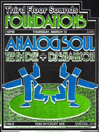 Third Floor Sounds: Foundations on March 12, 2026 at H0L0, New York features Analog Soul, TEE EM DEE and DJ Shannon performing house DJ sets.