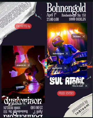 Threshold : Soulatomic & Dystorizon takes place at Bohnengold in Berlin, Germany on April 1, 2026. Featuring Dystorizon. House and Funk / Soul sounds all night.