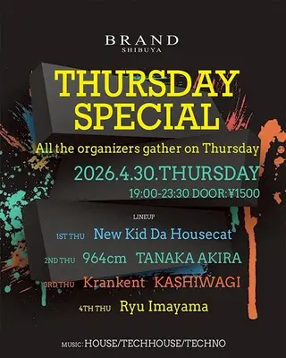 THURSDAY SPECIAL takes place at BRAND SHIBUYA in Tokyo, Japan on April 30, 2026. House and Tech House sounds all night.
