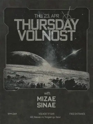 Thursday Volnost on April 23, 2026 at Volnost, Seoul features mizae lim and SINAE performing techno DJ sets.