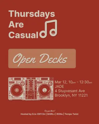 Thursdays are Casual: Open Decks takes place at Jade in New York, United States on March 12, 2026. Featuring Tempo Twist.