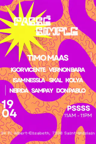 Techno and tech house event featuring Timo Maas, Igor Vicente, Vernon Bara, Sampay, Nierda, Isam Nessla, Skal, Don Pablo, and Kolya. The event takes place at Passé Simple on April 19, 2026. Timo Maas is a German DJ and producer known for his contributions to the techno genre and his work with prominent labels such as Bedrock. Igor Vicente hails from Spain, recognized for his deep tech house sounds and involvement in the Spanish electronic music scene. Sampay is an emerging artist in the tech house realm, bringing fresh influences to the genre. Don Pablo, also known for his tech house productions, has gained recognition in various electronic music circles. Additional artists include Vernon Bara, Nierda, Isam Nessla, Skal, and Kolya, contributing to a diverse lineup within the techno and tech house genres.