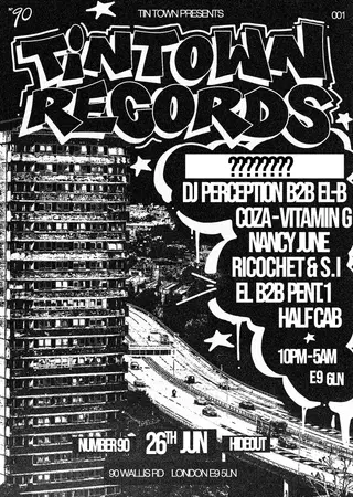 Tin Town Records - presents: 001 on June 26, 2026 at NUMBER 90 LONDON, London features DJ Perception, El-B and Nancy June performing garage DJ sets.