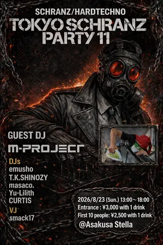 TOKYO SCHRANZ PARTY11 takes place at Asakusa Stella in Tokyo, Japan on August 23, 2026. Featuring M-Project. Techno and Industrial sounds all night.