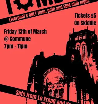 Tomb: Goth, Italo, EBM, Techno Night takes place at Commune in Liverpool, United Kingdom on March 13, 2026. EBM and Industrial sounds all night.