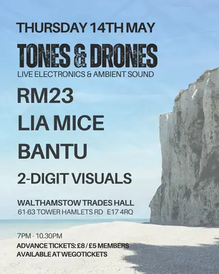 Tones & Drones: Lia Mice, Bantu, RM23 & 2-Digit Visuals takes place at Walthamstow Trades Hall in London, United Kingdom on May 14, 2026. Featuring Lia Mice. Ambient and Drone sounds all night.