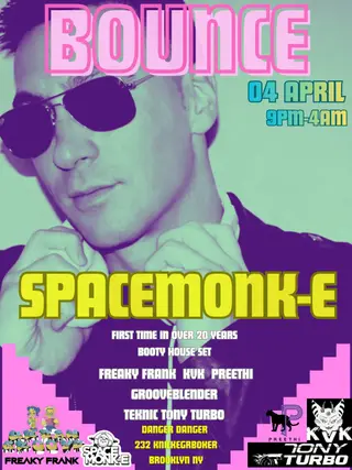 Tony Turbo presents Bounce Feat. Space Monk-E and Friends on April 4, 2026 at Danger Danger, New York City features Space Monk-E performing house DJ sets.