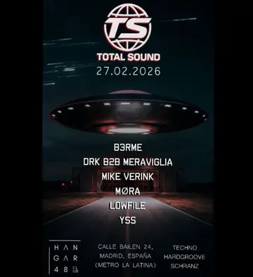 Set at Hangar48 Club, TOTAL SOUND: B3rme, DARK, MERAVIGLIA, MIKE VERINK, MORA, LOWFILE, YSS 2026 brings together artists and fans in Miami on Friday, February 27, 2026. This event brings together artists and fans who share a passion for dance music culture and Techno sounds.