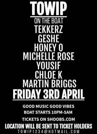 TOWIP ON THE BOAT takes place at Secret Location in London, United Kingdom on April 3, 2026. Featuring Lauza Lashes. Deep House and Afro House sounds all night.