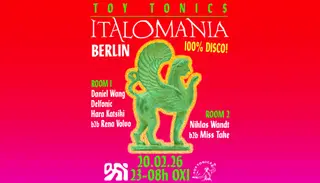 Toy Tonics presents ITALOMANIA takes place at OXI in Berlin, Germany on February 20, 2026. Featuring Daniel Wang, Delfonic, Hara Katsiki, Rena Volvo and 2 more. Disco and Italo Disco sounds all night.