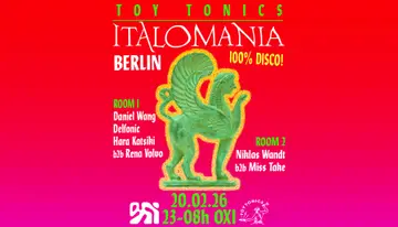 Toy Tonics presents ITALOMANIA takes place at OXI in Berlin, Germany on Friday, February 20, 2026. Featuring Daniel Wang, Delfonic, Hara Katsiki, Rena Volvo and 2 more. Disco, Italo Disco.