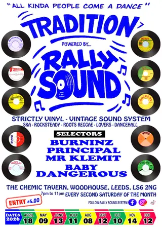 Tradition powered by Rally Sound takes place at The Chemic Tavern in Leeds, United Kingdom on April 18, 2026. Dub and Dancehall sounds all night.