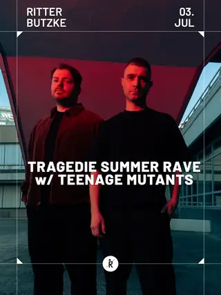 Tragedie SUMMER RAVE on July 3, 2026 at Ritter Butzke, Berlin features Teenage Mutants, Mehr is Mehr, Tonino, Eric Wishes, Budiratsch and Dimitri (1) performing techno DJ sets.