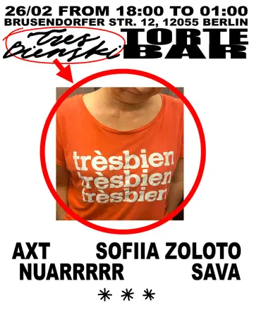 TRES BIENSKI x TORTE takes place at TORTE BAR in Berlin, Germany on Thursday, February 26, 2026. Featuring AXT, Sofiia Zoloto, nuarrrrr, Sava (3). House.