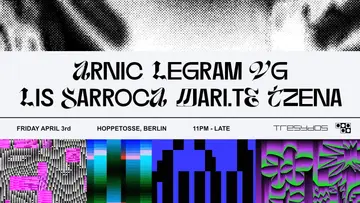 tresydos 2026 takes place at the renowned Hoppetosse in Berlin, Germany on Friday, April 3, 2026, featuring Arnic, LEGRAM VG, Lis Sarroca and 2 more artists. This event brings together artists and fans who share a passion for dance music culture and Techno, House sounds.