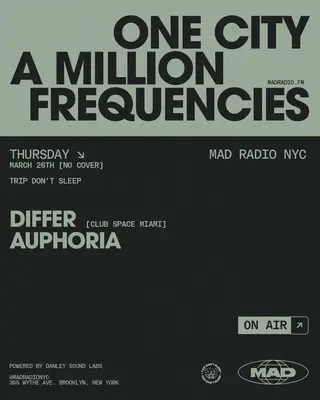 TRIP DON'T SLEEP: DIFFER (Club Space Miami) / Auphoria takes place at MAD Radio NYC in New York City on March 26, 2026. Featuring DIFFER, Auphoria. Tech House, Minimal.