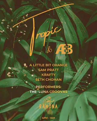 Tropic x ABB on May 2, 2026 at Ramona, Manchester features Sam Pratt, A Little Bit Orange, Seth Chohan, KRÄFTY and The Luna Groovas performing house DJ sets.