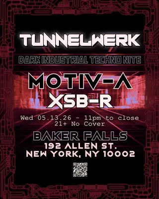 TUNNELWERK: DARK INDUSTRIAL TECHNO NITE - ft motiv-a & XSB-R on May 13, 2026 at Baker Falls, New York City features motiv-a and XSB-R performing techno DJ sets.