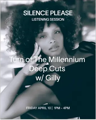 Turn of the Millennium Deep Cuts with Gilly takes place at Silence Please in New York City, United States on April 10, 2026. Breakbeat and Jazz sounds all night.