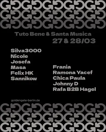 Tuto Bene & Santa Musica takes place at Golden Gate in Berlin, Germany on Friday, March 27, 2026. Featuring Silva3000, Nicole, MASA, Felix Hk and 6 more.